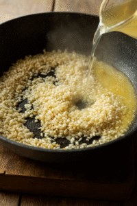 - Toast the rice: Add arborio rice and stir for 1 minute until the grains are coated and slightly translucent. ๐
