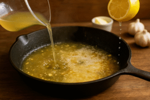 - Add Lemon and Broth:Pour in chicken broth, lemon juice, and zest. Stir and scrape the bottom of the pan to release flavor. Simmer 2–3 minutes.