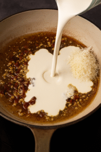 - Make the creamy sauce: Pour in the heavy cream, season with salt and pepper, and simmer for 2 minutes. Stir in grated parmesan until melted and smooth.