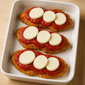 - Assemble: Place cooked chicken in a baking dish, spoon marinara sauce on top, and add mozzarella.