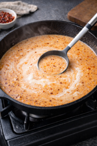 Cream is added toward the end to soften the spice and create a smooth, luxurious texture. The result is a broth that feels rich without masking the heat or the savory depth underneath.