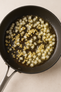 - Step 3 – Cook the Aromatics: In the same skillet, melt butter, add garlic and onion, and sauté until fragrant.