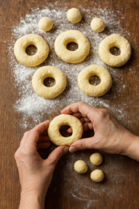 - Shape the papanasi: Divide the dough into 6 portions. Shape each into a ball, then make a small hole in the center (like a doughnut). Use leftover dough to form 6 small balls for the tops.