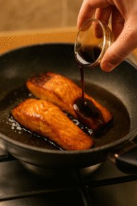 - Add the Sauce: Pour the prepared teriyaki sauce over the salmon. Simmer for 2–3 minutes until the glaze thickens and coats the fillets beautifully.